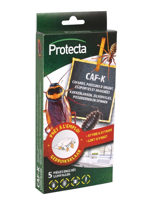 De “Caf-K” vallen zullen alle soorten kakkerlakken doeltreffend vangen, maar kunnen ook gebruikt worden voor het efficiënt vangen van spinnen en zilvervisjes. De lijmvallen bevatten een sterk lokaas dat insecten naar de lijm zal lokken. Het product is geurloos en bevat geen insecticide. Voor monitoring.